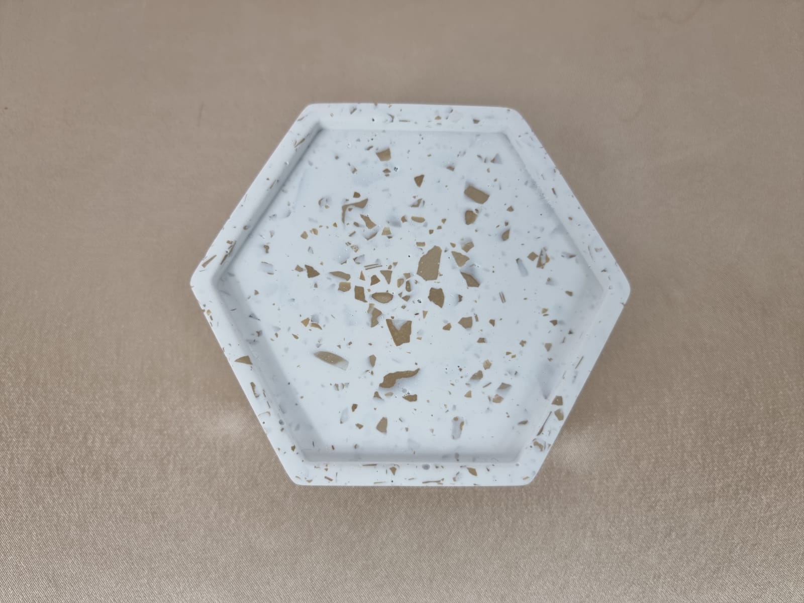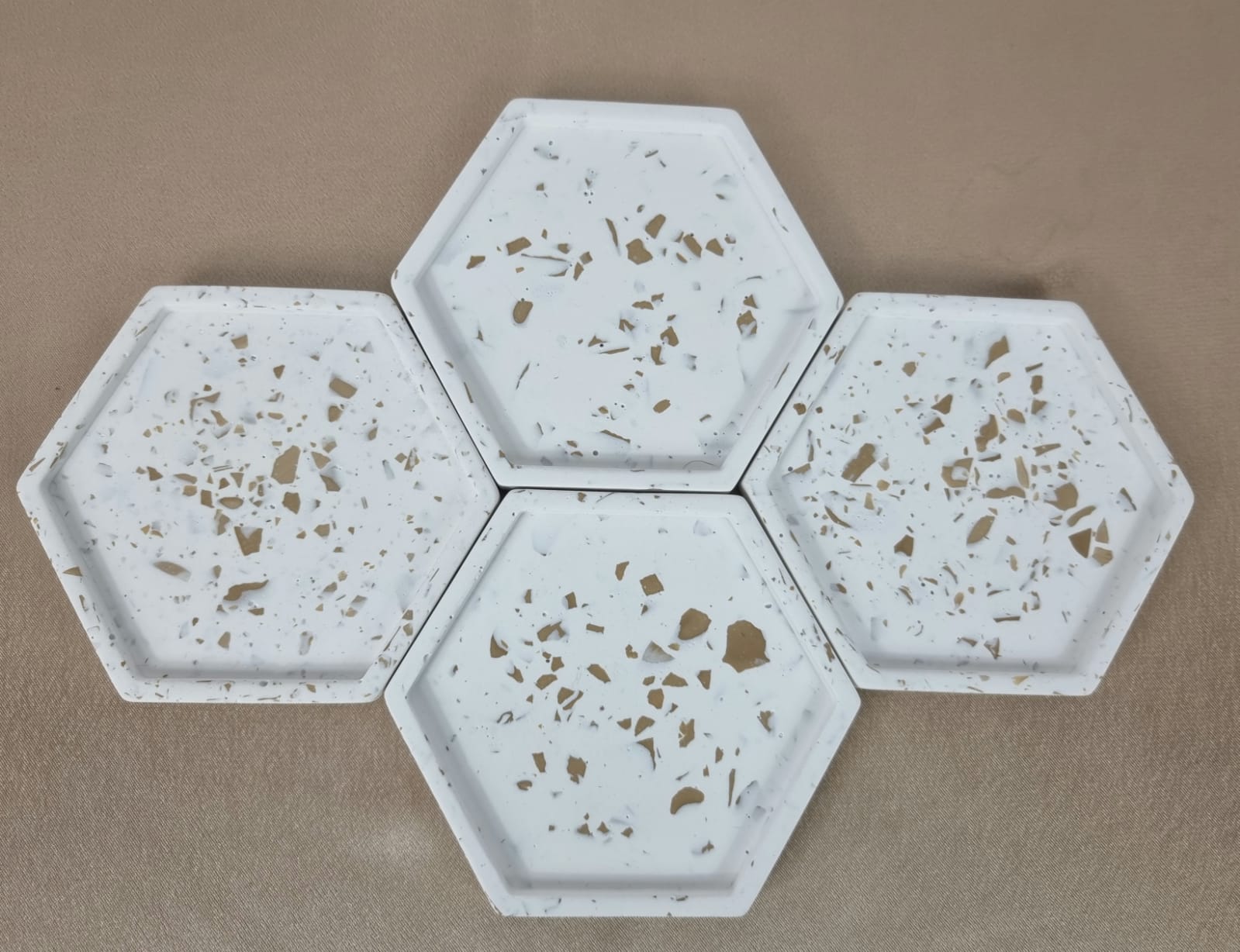 Two white Hexagon shaped coasters with chocolate terrazzo chips